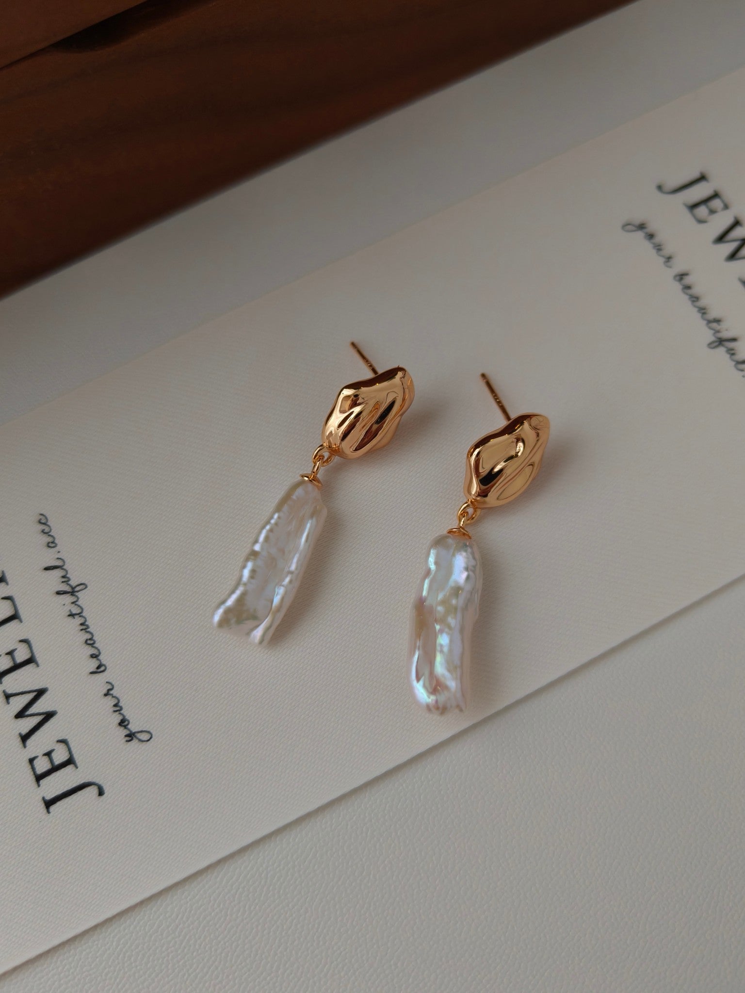 These Baroque Pearl Drop Earrings combine organic beauty with sculptural modern design. The top features a molten gold-inspired piece — fluid, irregular, and artistic — paired with long, natural baroque pearls that shimmer with iridescent tones.